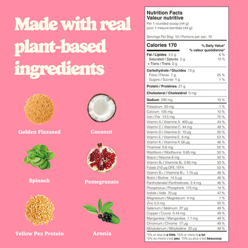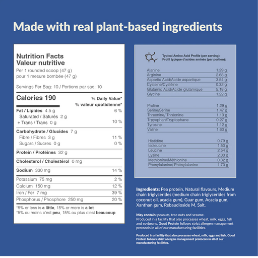 GOODPROTEINIngredients: Protein blend (pea protein, milled golden flaxseed), natural flavours, soluble tapioca fibers, coconut milk powder* (coconut milk powd...